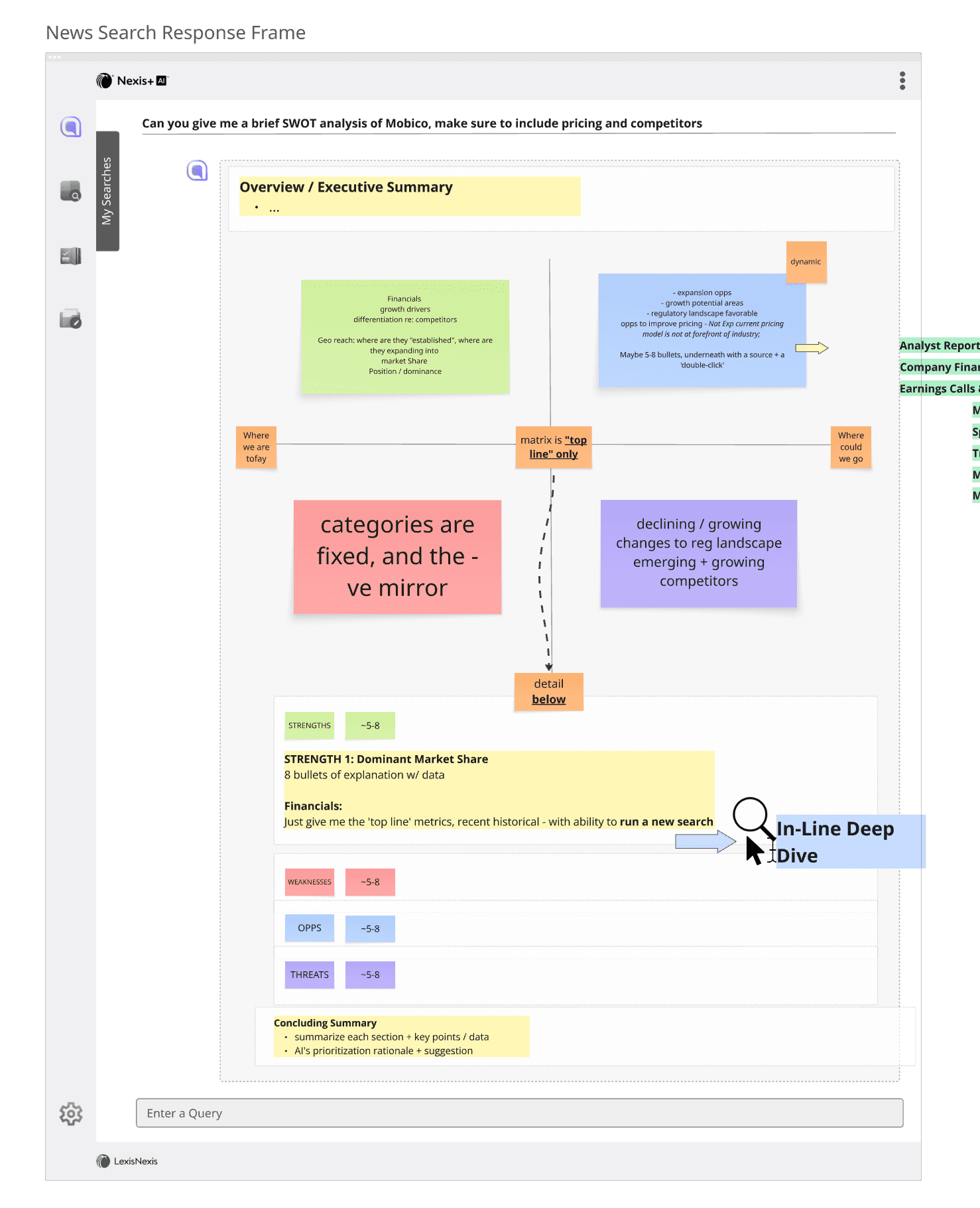 I led the research and design of our flagship investigative initiative, Co-Design, the most pivotal piece of work this year shaping our product vision and AI design strategy. The objective was to uncover how business context, use case scenarios, and user intent inform the definition of an ideal AI response, one that balances UX, key data, sources, functionality, interaction, and user behaviour. To achieve this, in-depth interviews, were conducted, with business consultants, analysing not only what questions they asked but also the business logic and lived context behind those queries.