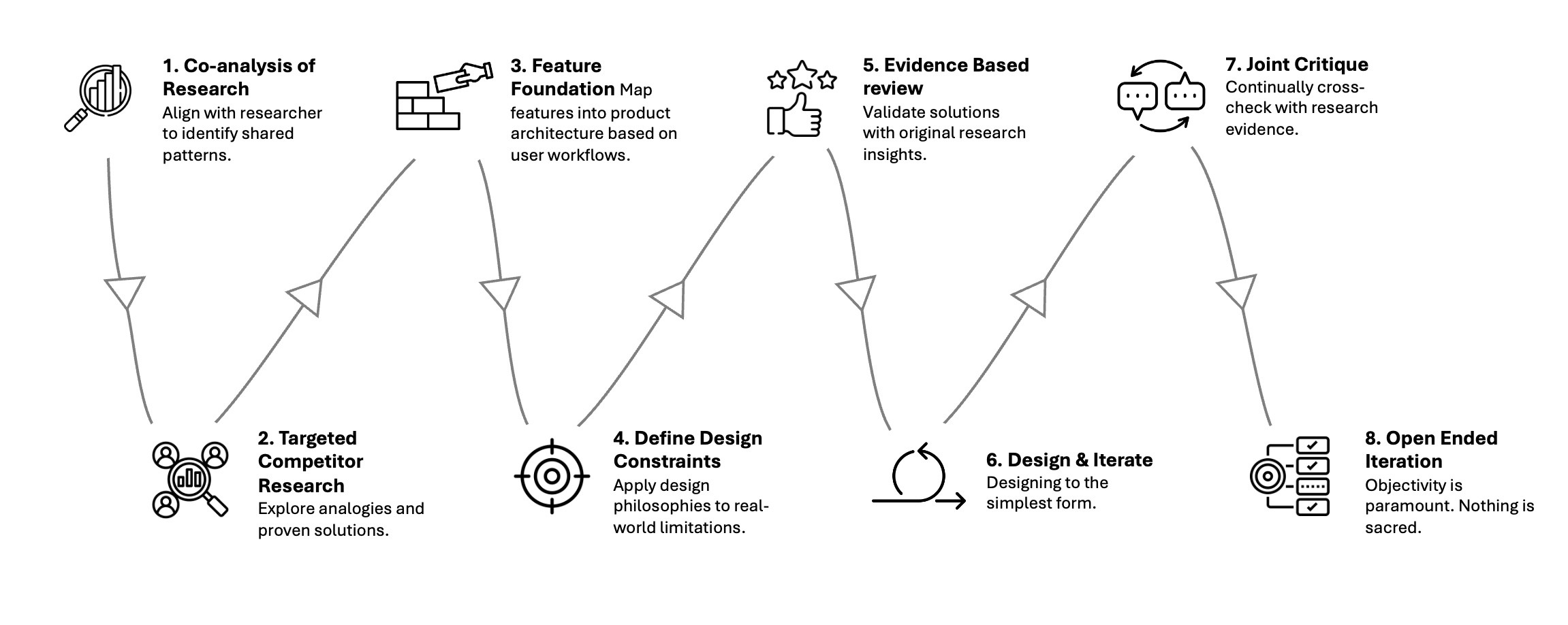 Great design isn’t built on assumptions, it’s grounded in evidence. I created an iterative research process that ensures every creative decision connects back to real user needs, business context, and system constraints. This approach is problem-first, not feature-first, drawing inspiration from solutions to similar challenges both near and far. Every design choice can be traced back to data, and critique sessions with researchers. The result is design that is not only creative, but also defensible, scalable, and aligned with real-world impact.